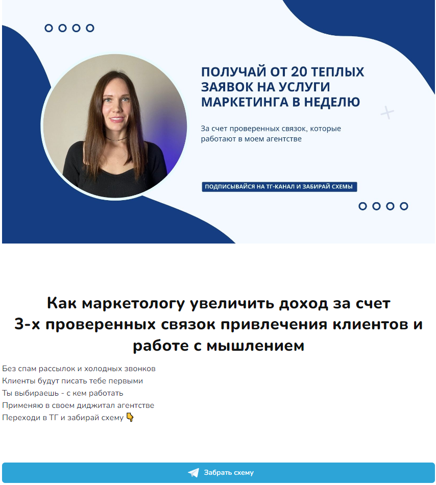 - Конвертер, который знакомит людей с вами, вашей методикой. Он состоит из посадочной страницы и непосредственно бота в ТГ, в который попадает потенциальный клиент.